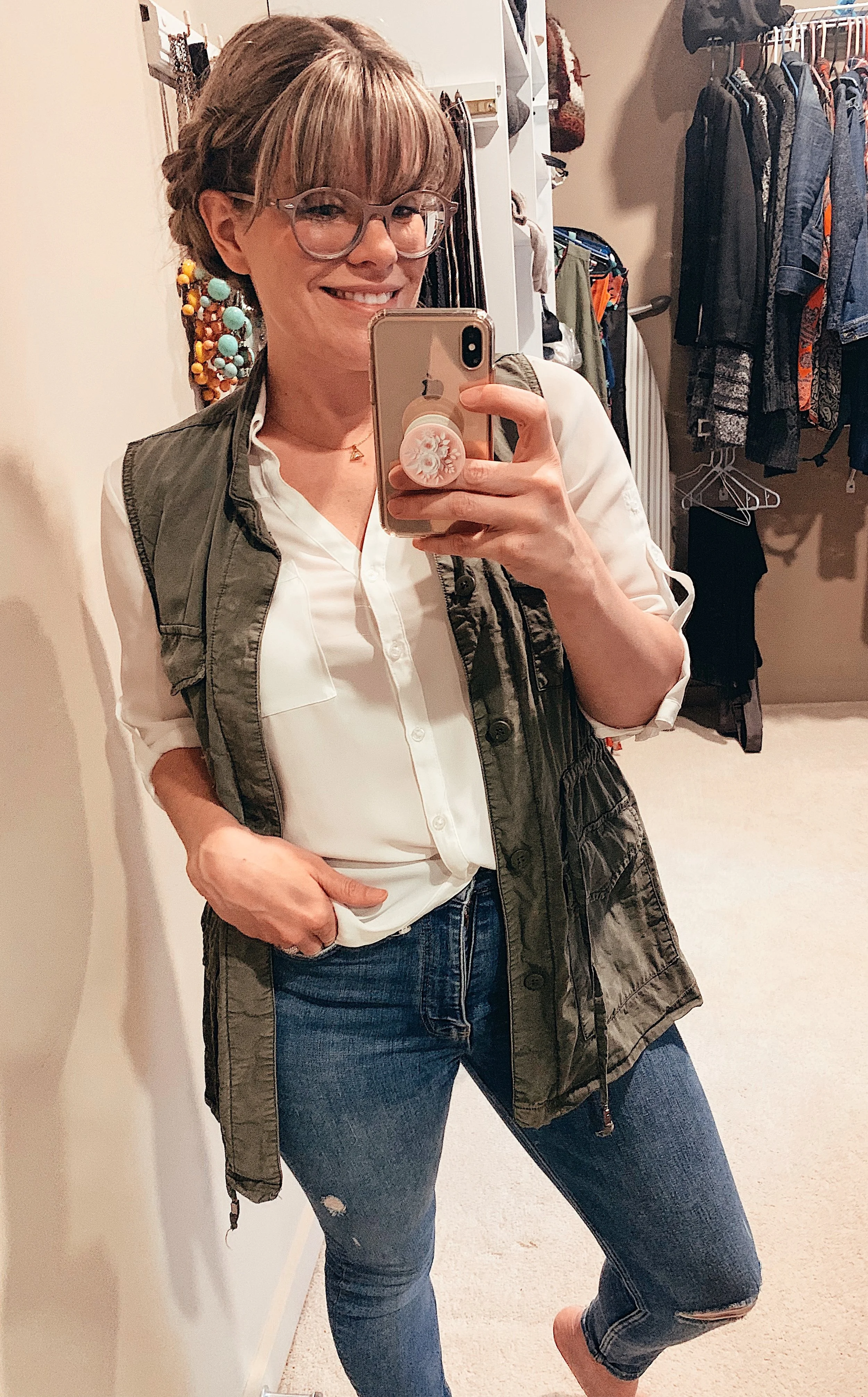 For another look, I just added an olive green utility jacket. This one is from Target. Still keeping it pretty casual, but also another great option for going out with your guy.